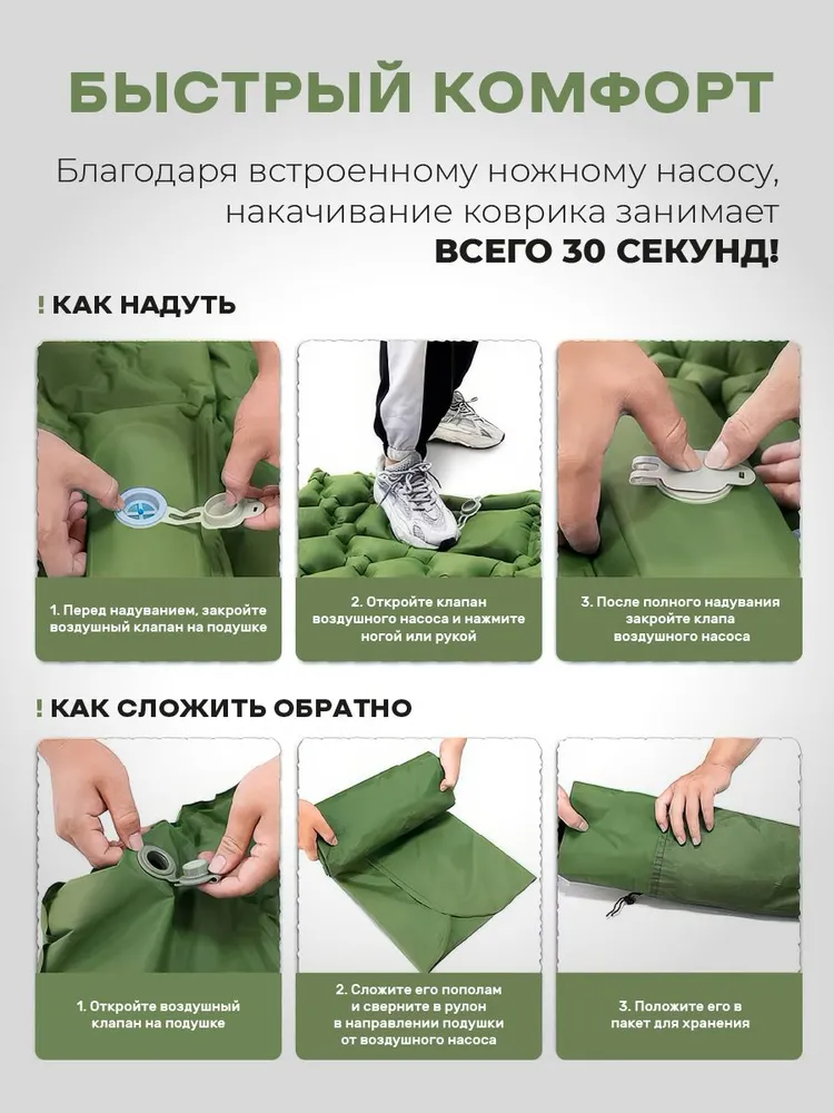 Сверхбыстрое надувание – всего 30-60 секунд благодаря мощному встроенному ножному насосу